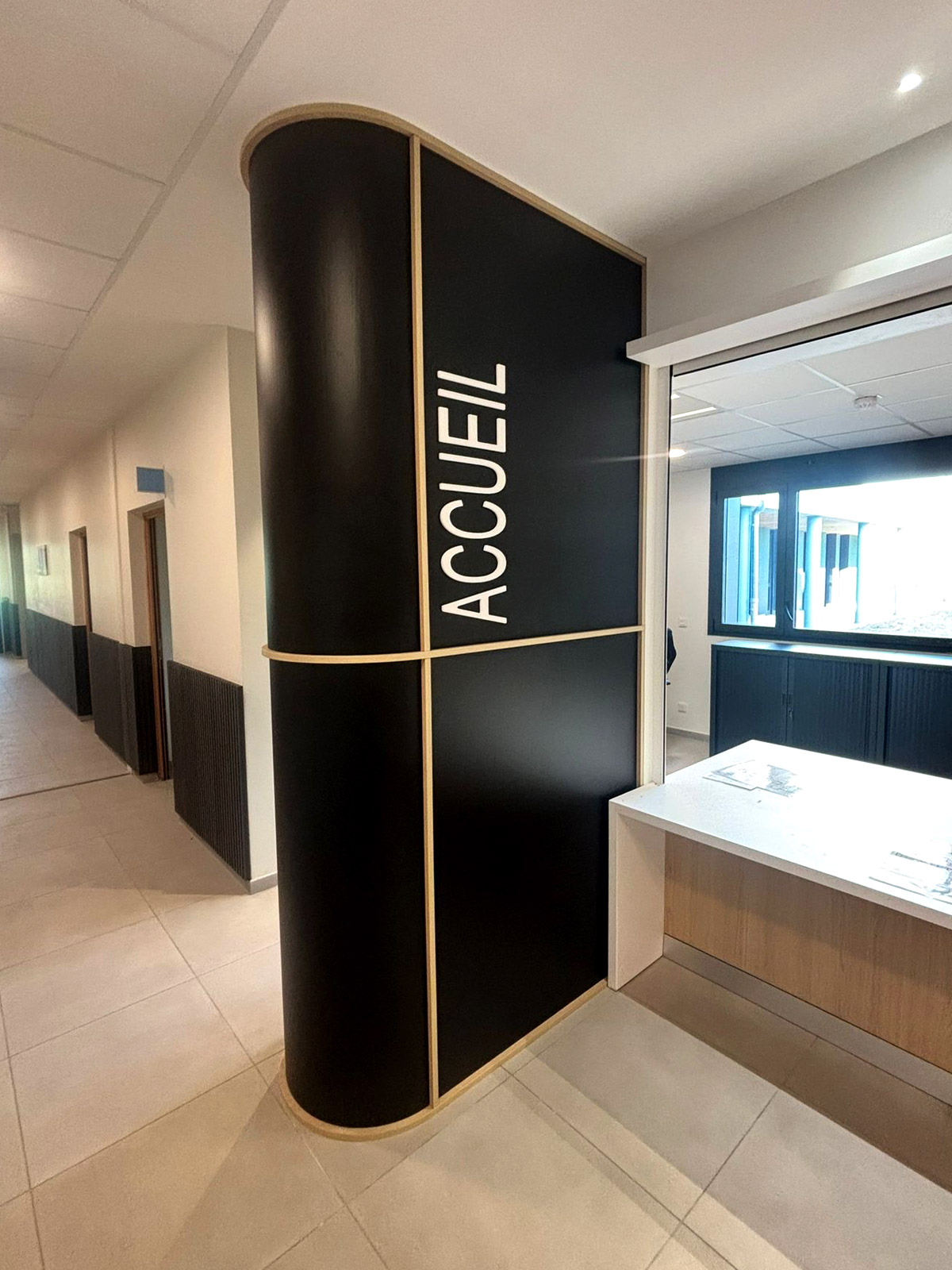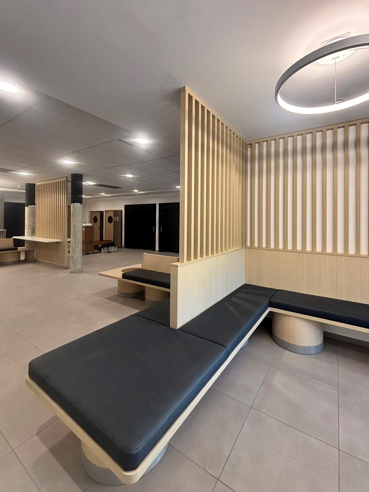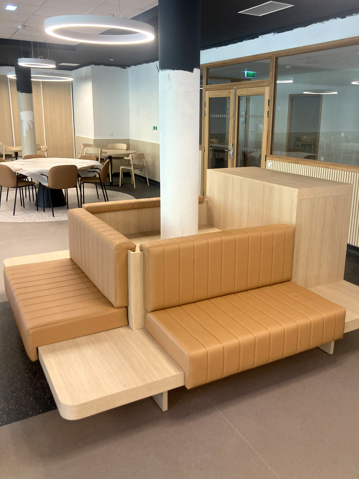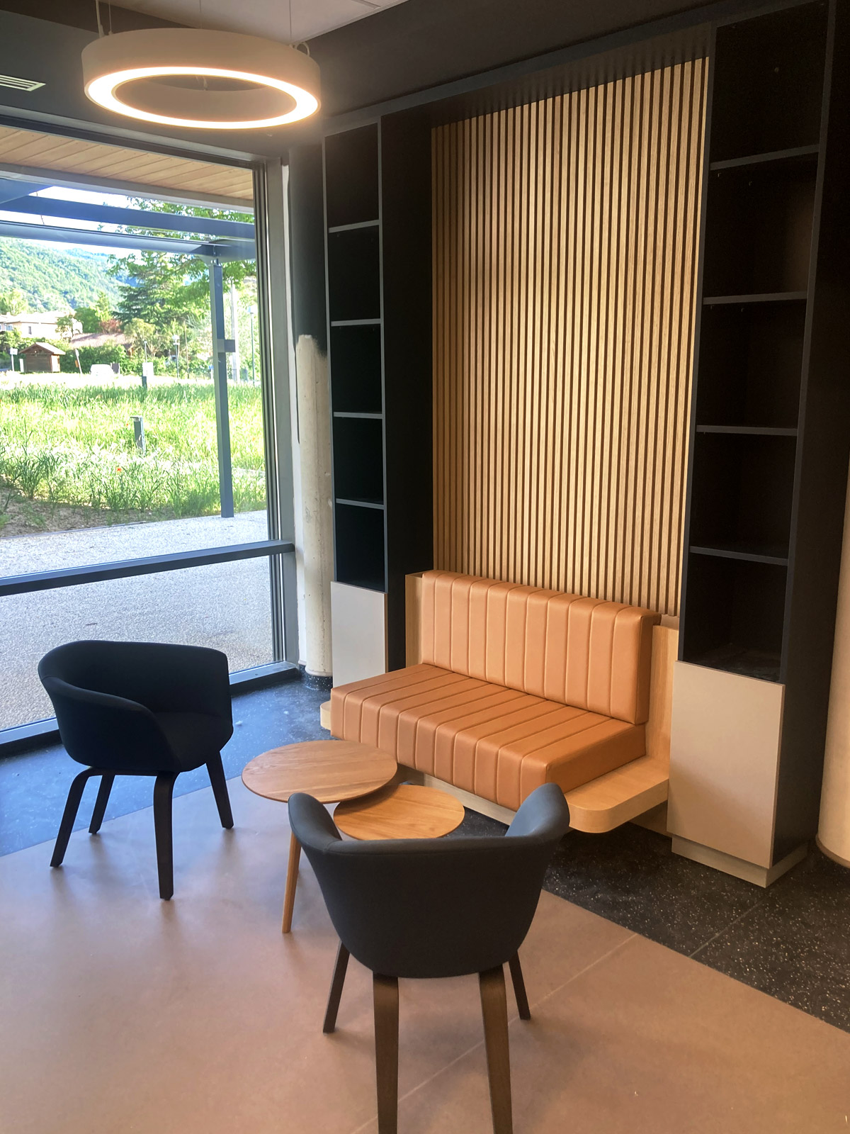 Fourniture et pose agencements de l’accueil du site et de la salle de restaurant.